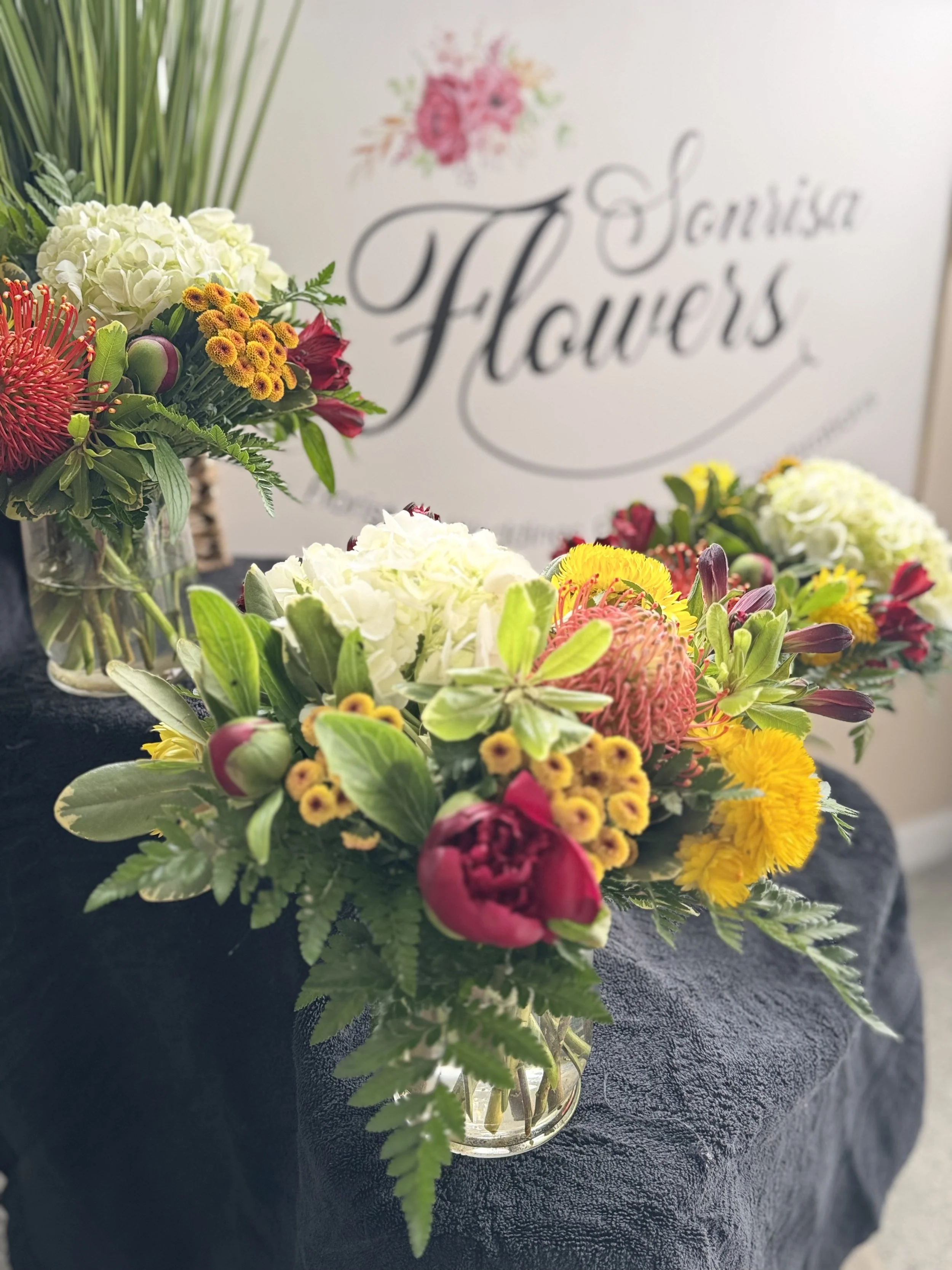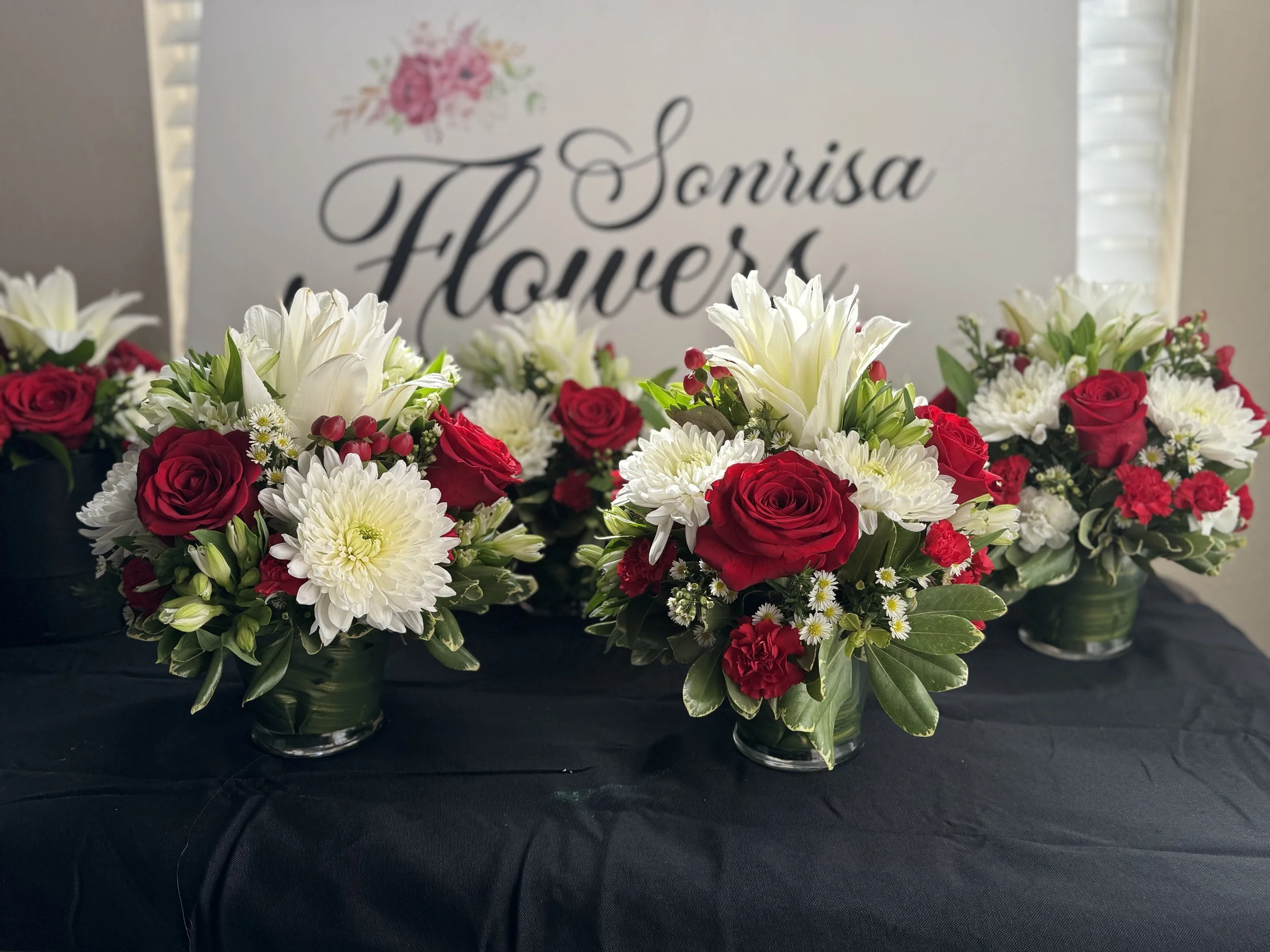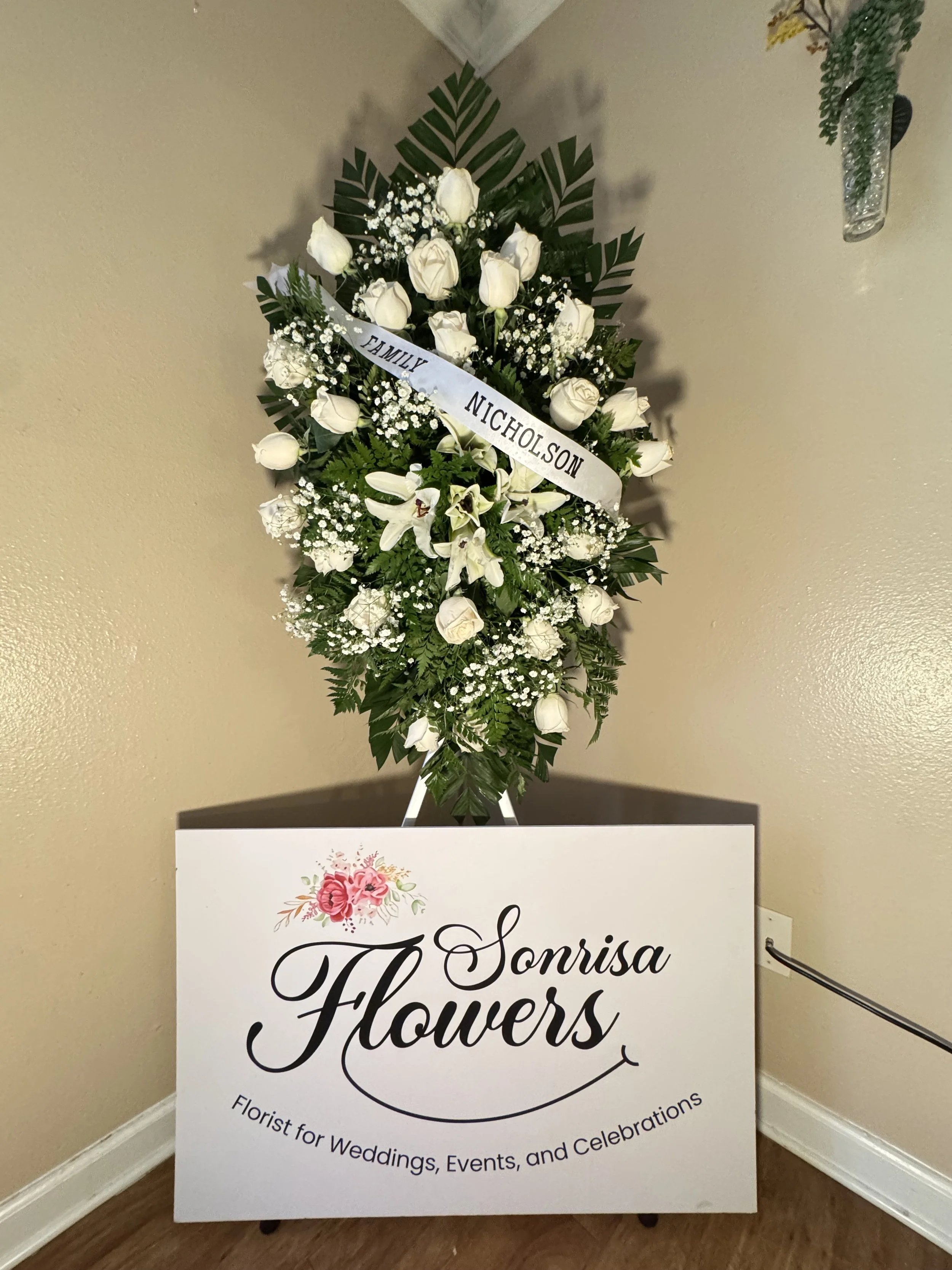 Floral arrangement with white roses, lilies, and greenery, featuring a ribbon with the name 'Family Nicholson.' Displayed on an easel above a sign reading 'Sonrisa Flowers, Florist for Weddings, Events, and Celebrations.'