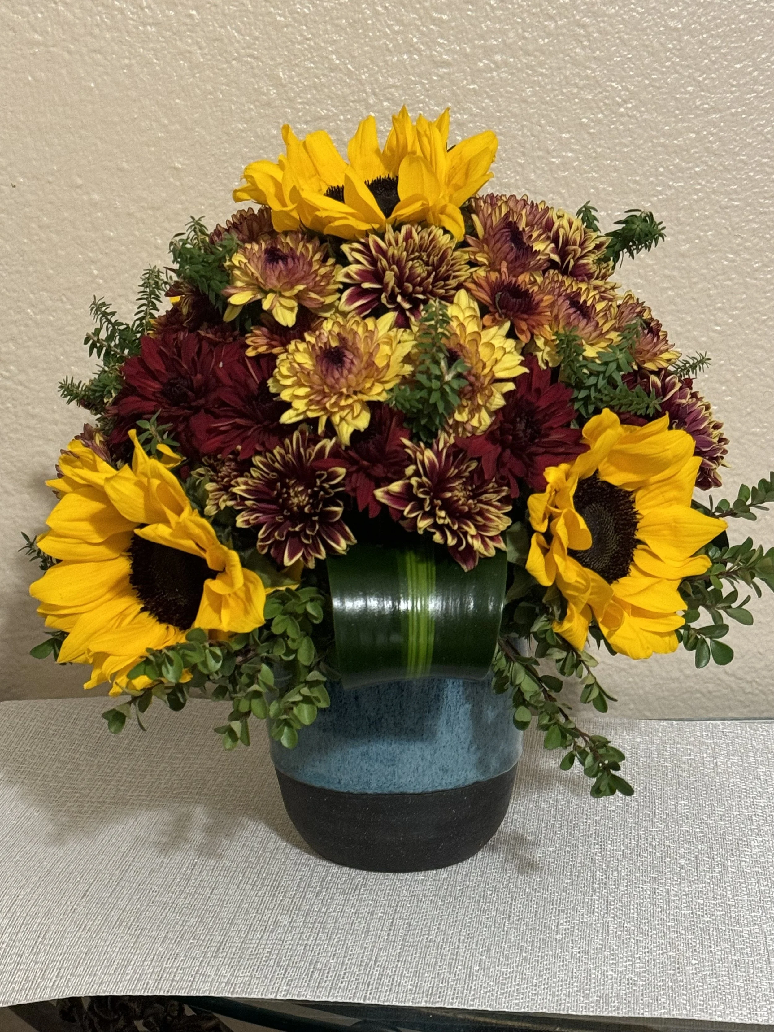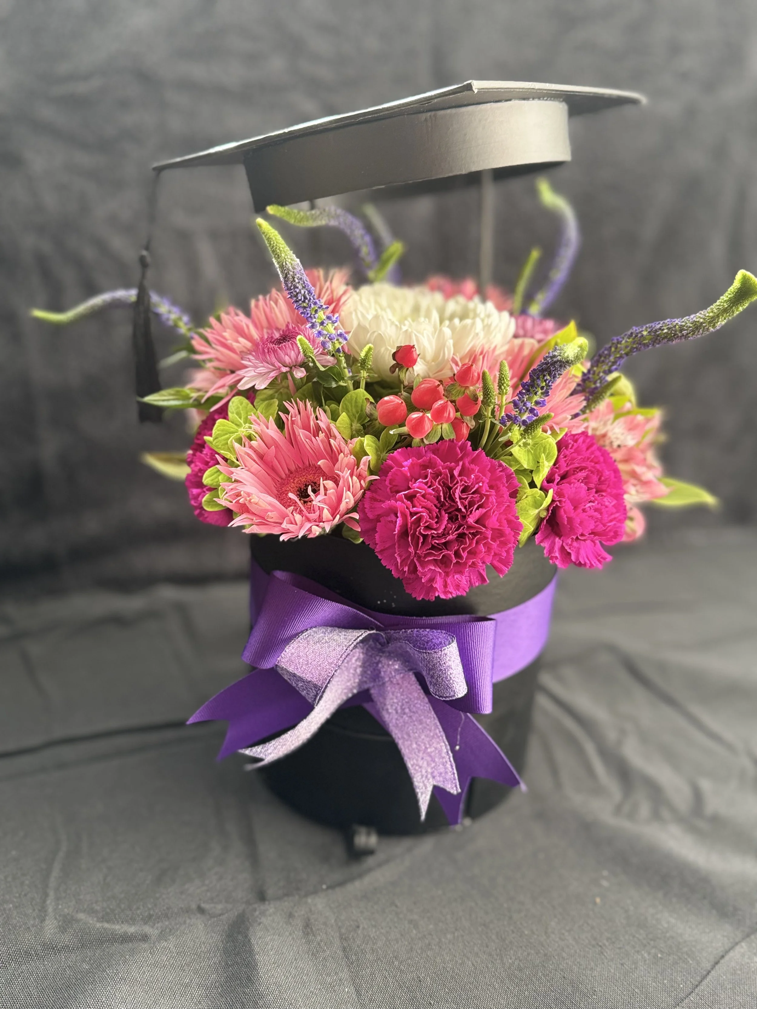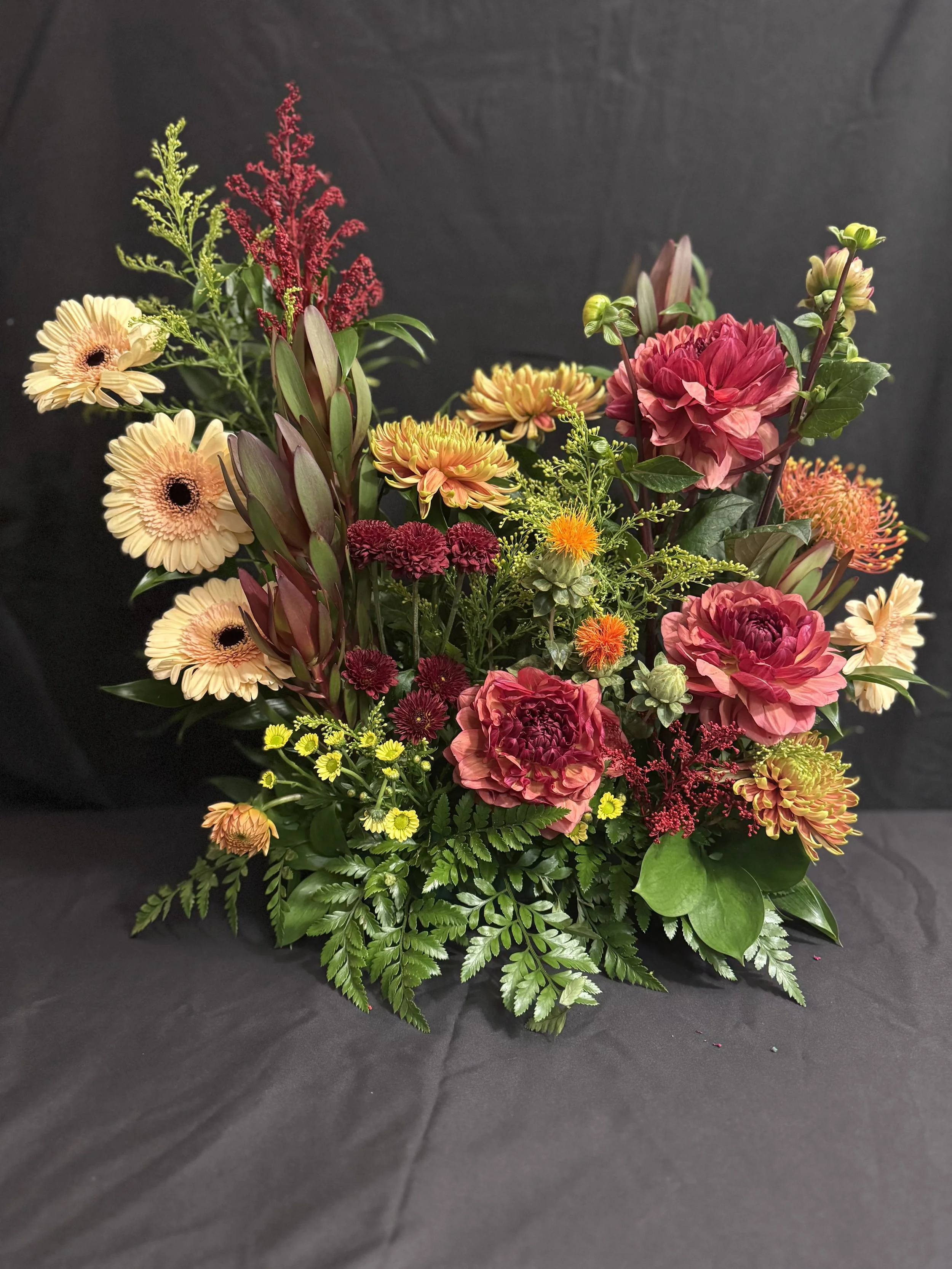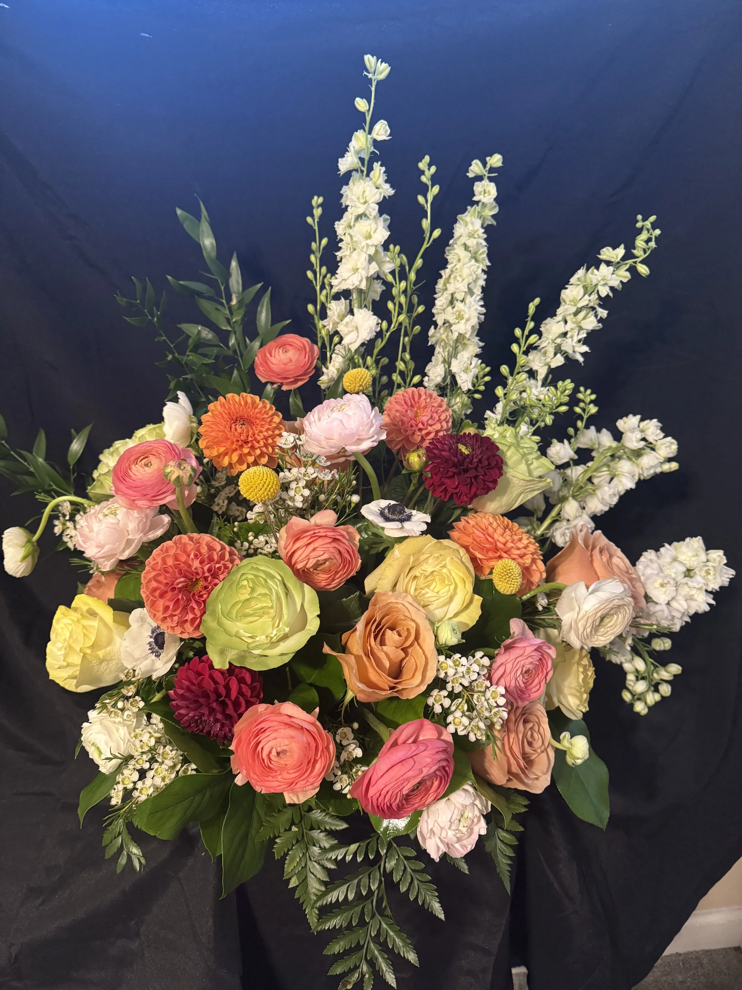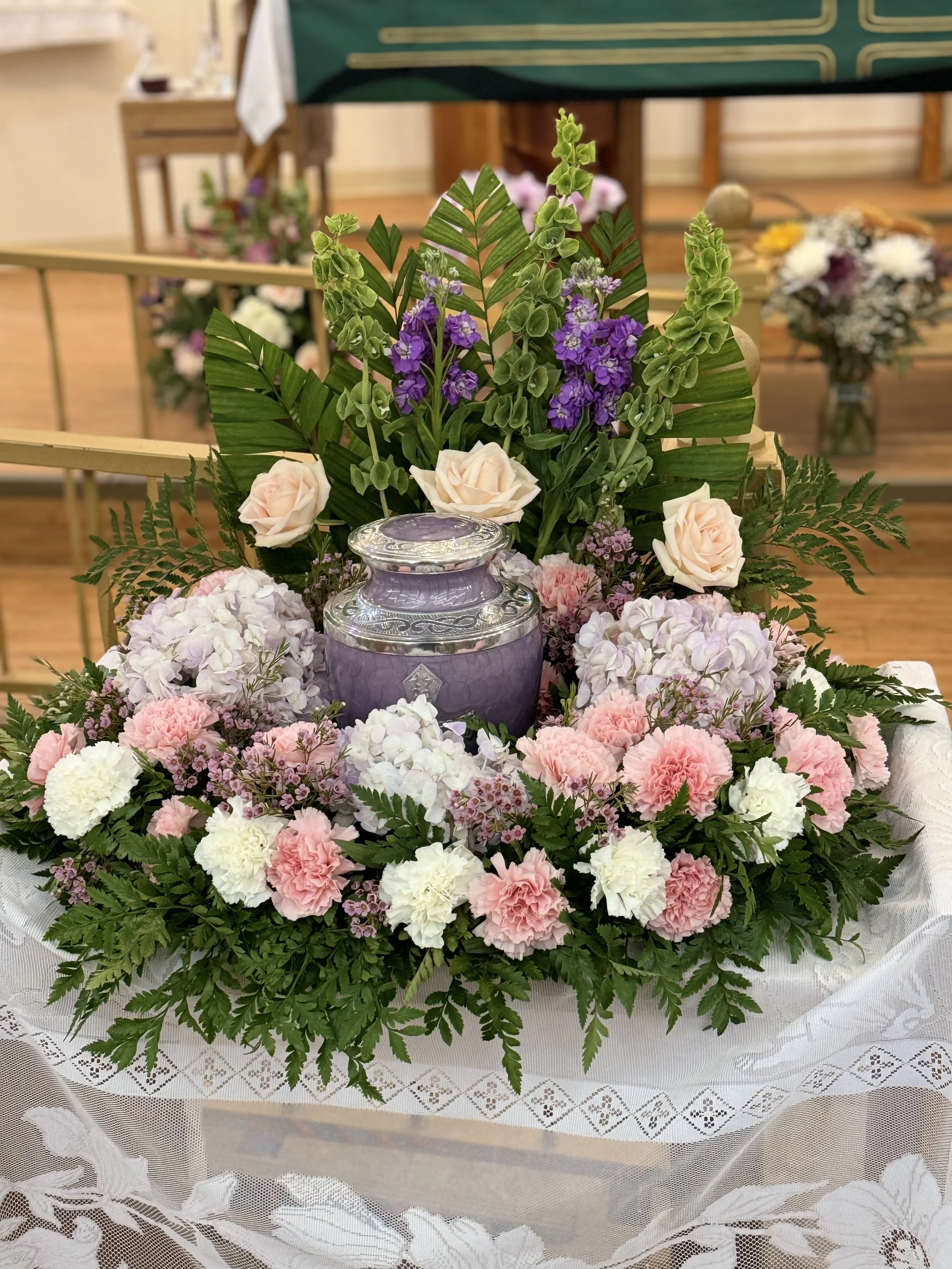 Floral arrangement with purple urn, including roses and carnations, displayed in a church setting.