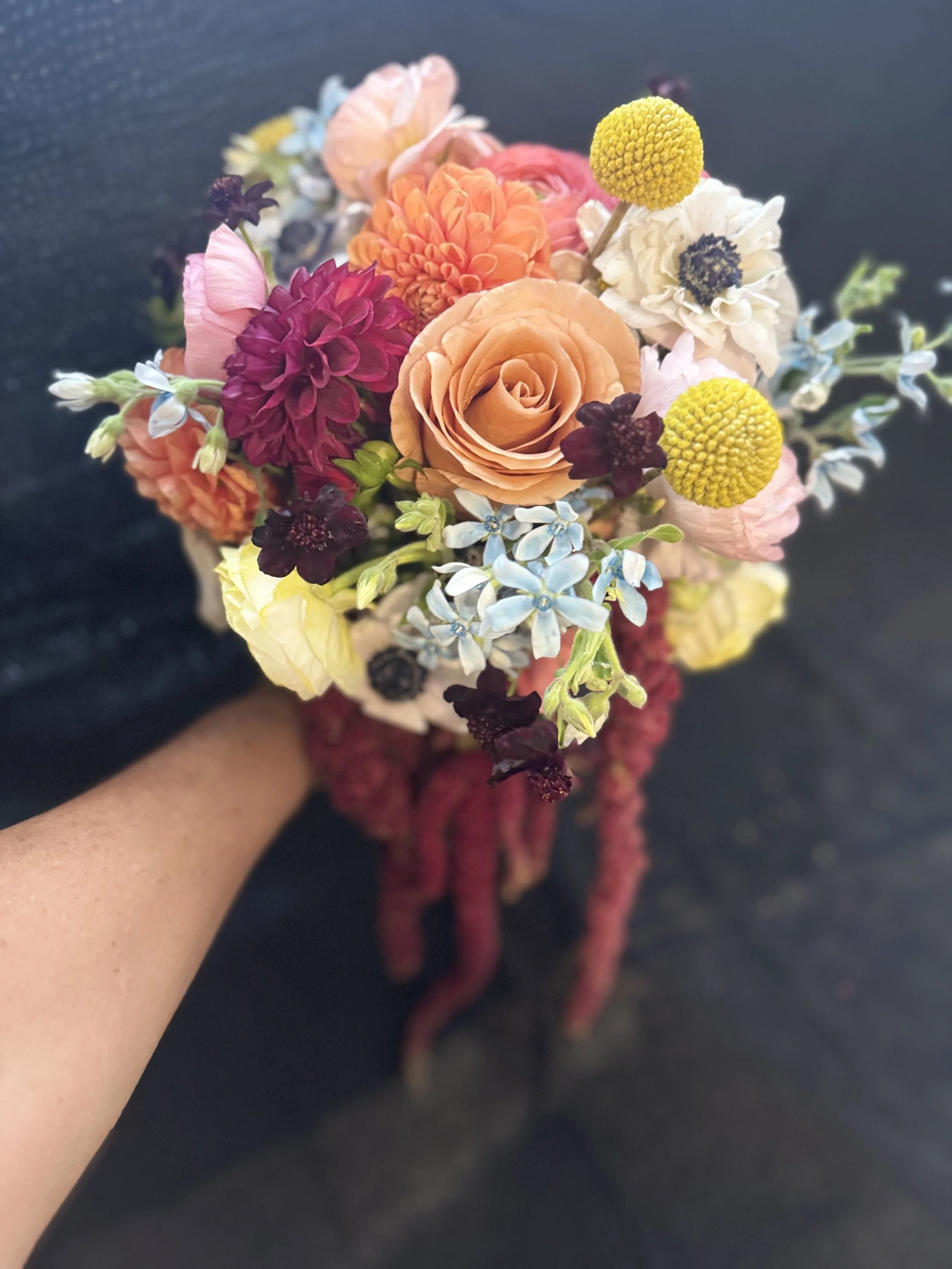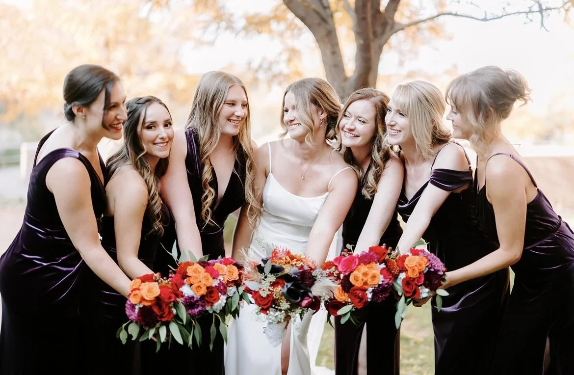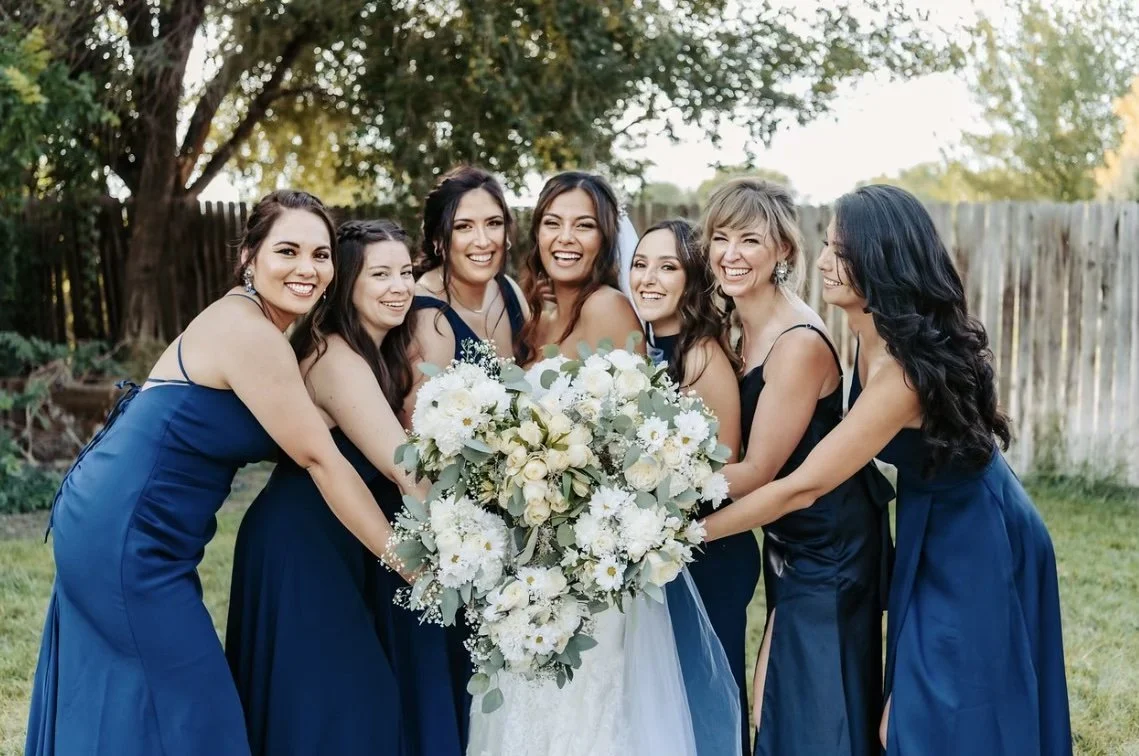Bride with bridesmaids in blue dresses holding a large flower bouquet outdoors.