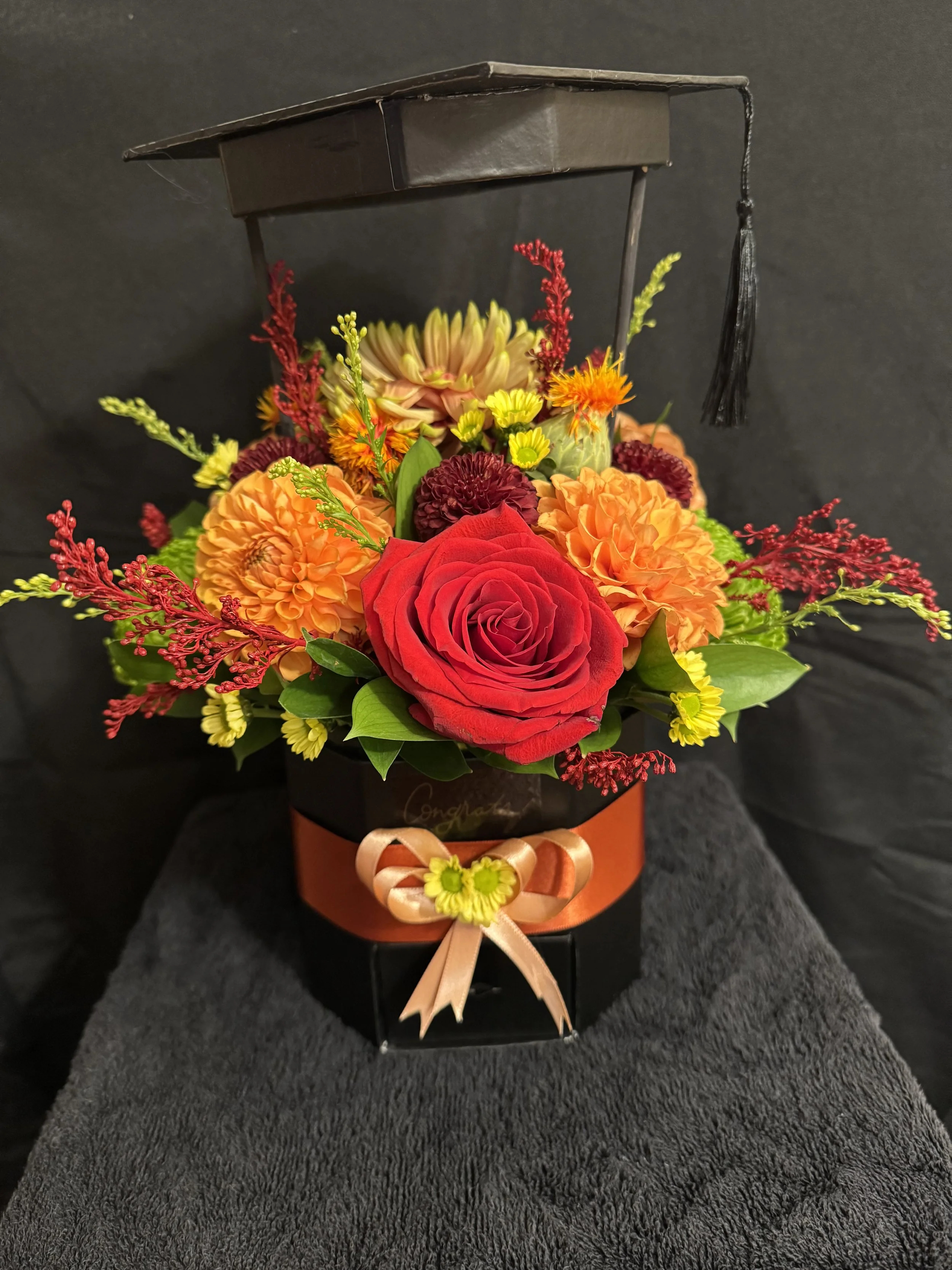Floral arrangement with orange and white flowers on a table with white tablecloth and orange runner, surrounded by white chairs.