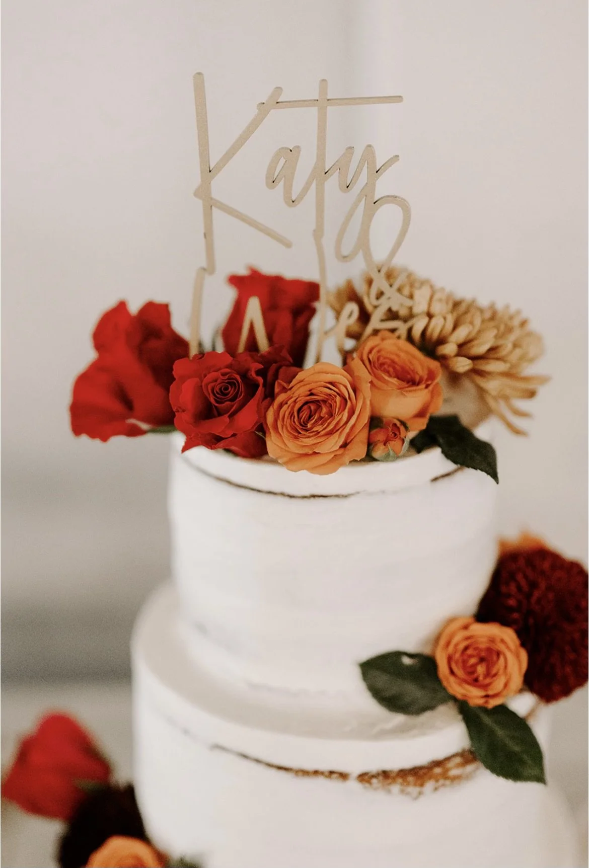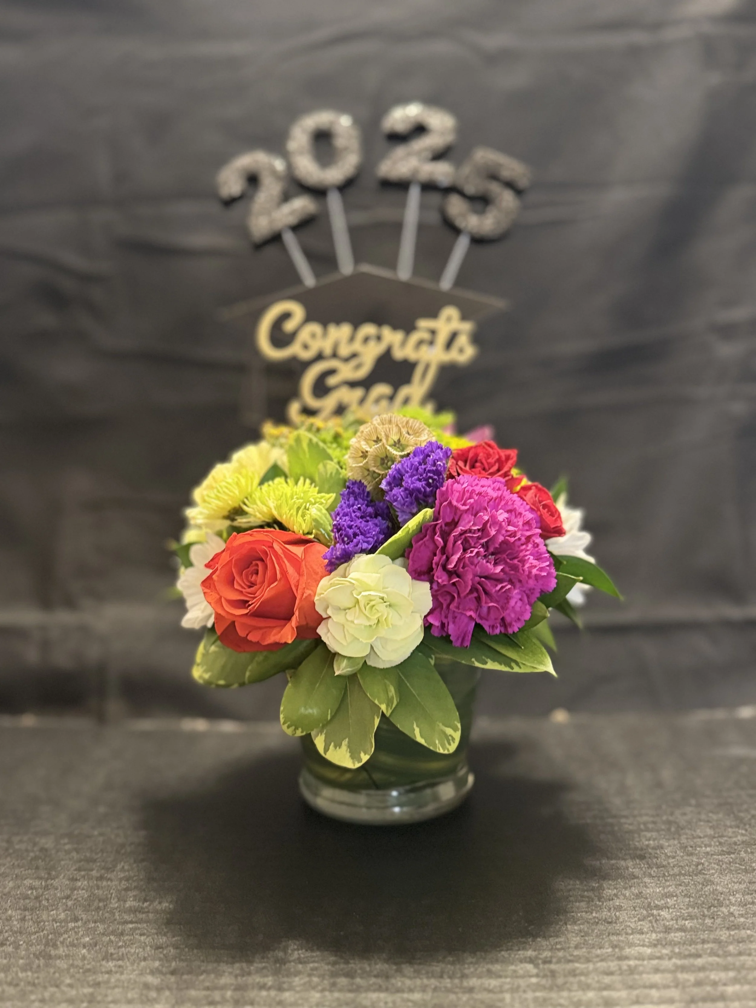 Table centerpiece with colorful flowers, candles, and a "Table Twelve" sign.