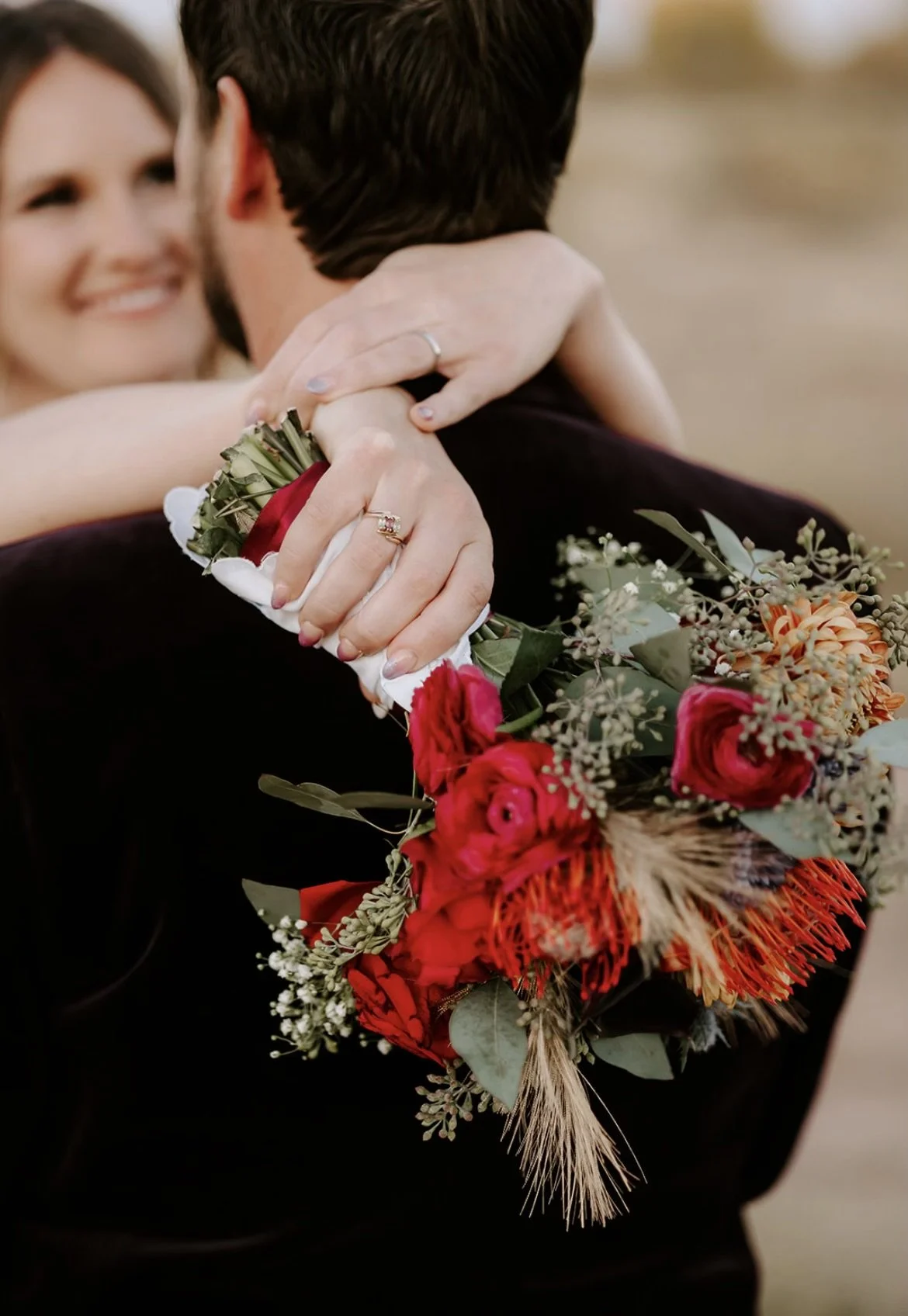 A woman embraces a man, visible from the back, holding a bouquet of red flowers and greenery. Her hand, adorned with a ring, is seen resting on his shoulder.