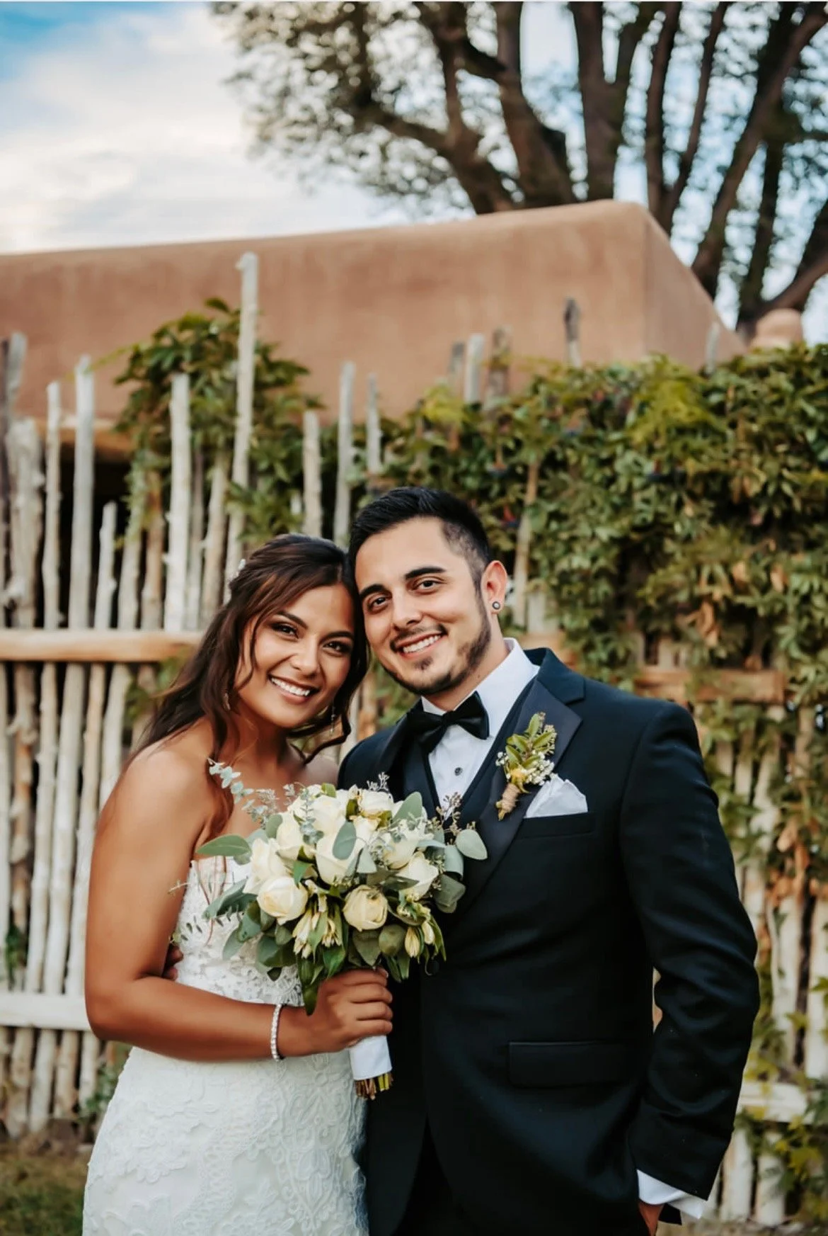 Bride and groom smiling, bride holding bouquet, groom in tuxedo, outdoor setting with rustic fence and greenery.