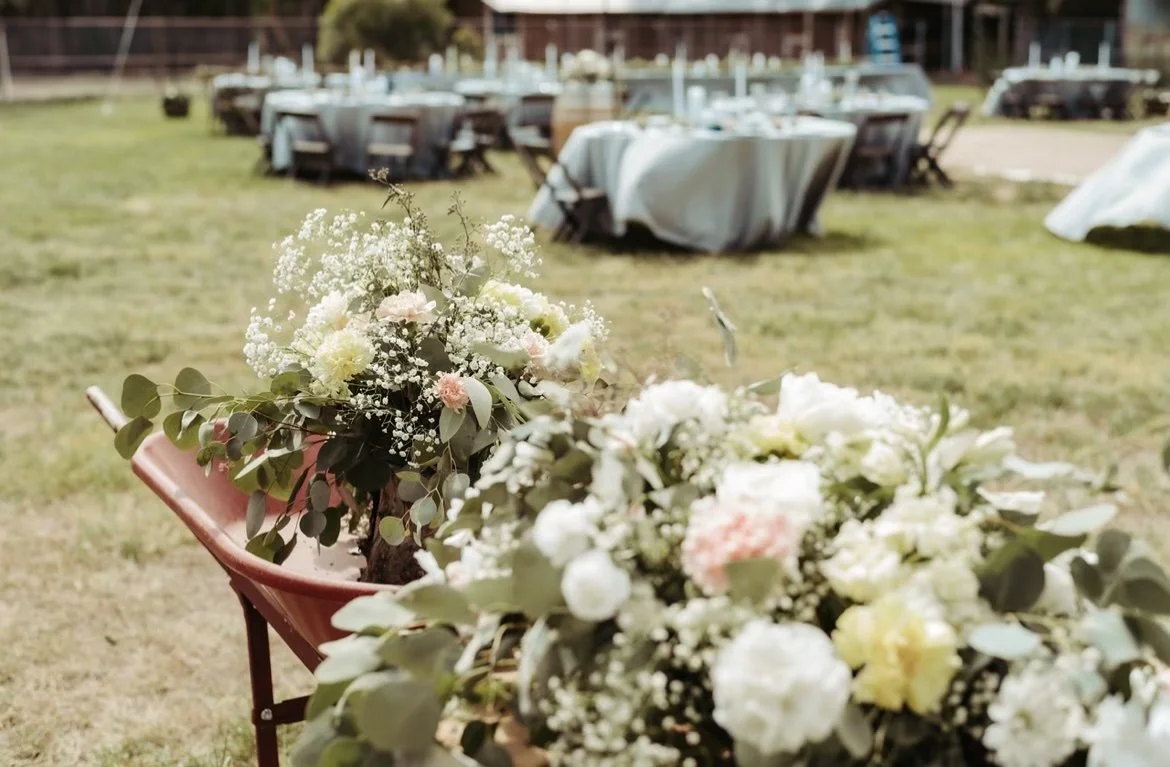 Outdoor wedding setup with flower arrangements in a wheelbarrow and tables set for an event on a grassy lawn.